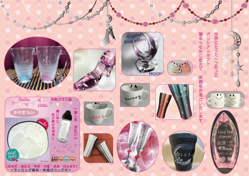 ギフトショップ汐音では、サンドブラスト彫刻による名入れ彫刻を中心に製作・販売しております。